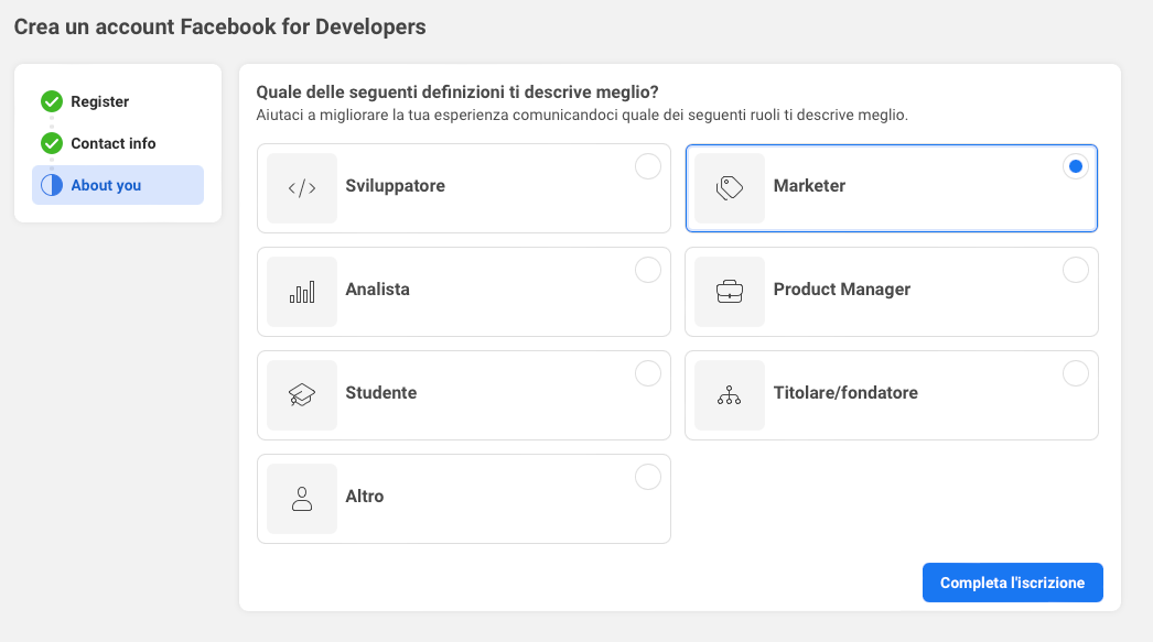 3. Nella schermata seguente selezionare "**Marketer**" e premere "**Completa l'iscrizione**".