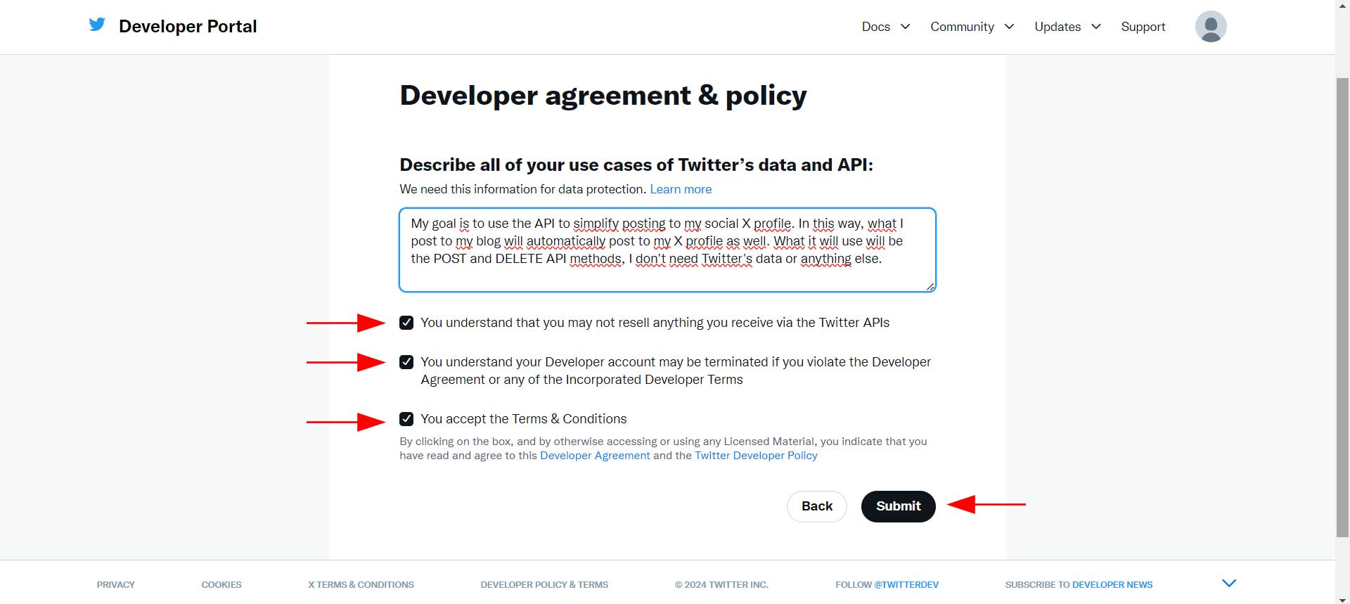 3. Una volta fatto, verrà chiesto di scrivere **per quali ragioni si vogliono usare le API di Twitter**. Copiare e incollare questo: "*My goal is to use the API to simplify posting to my social X profile. In this way, what I post to my blog will automatically post to my X profile as well. What it will use will be the POST and DELETE API methods, I don't need Twitter's data or anything else.*" Successivamente, **spuntare le tre caselle** al di sotto e procedere cliccando su **Submit.** (come nella foto a seguire)
